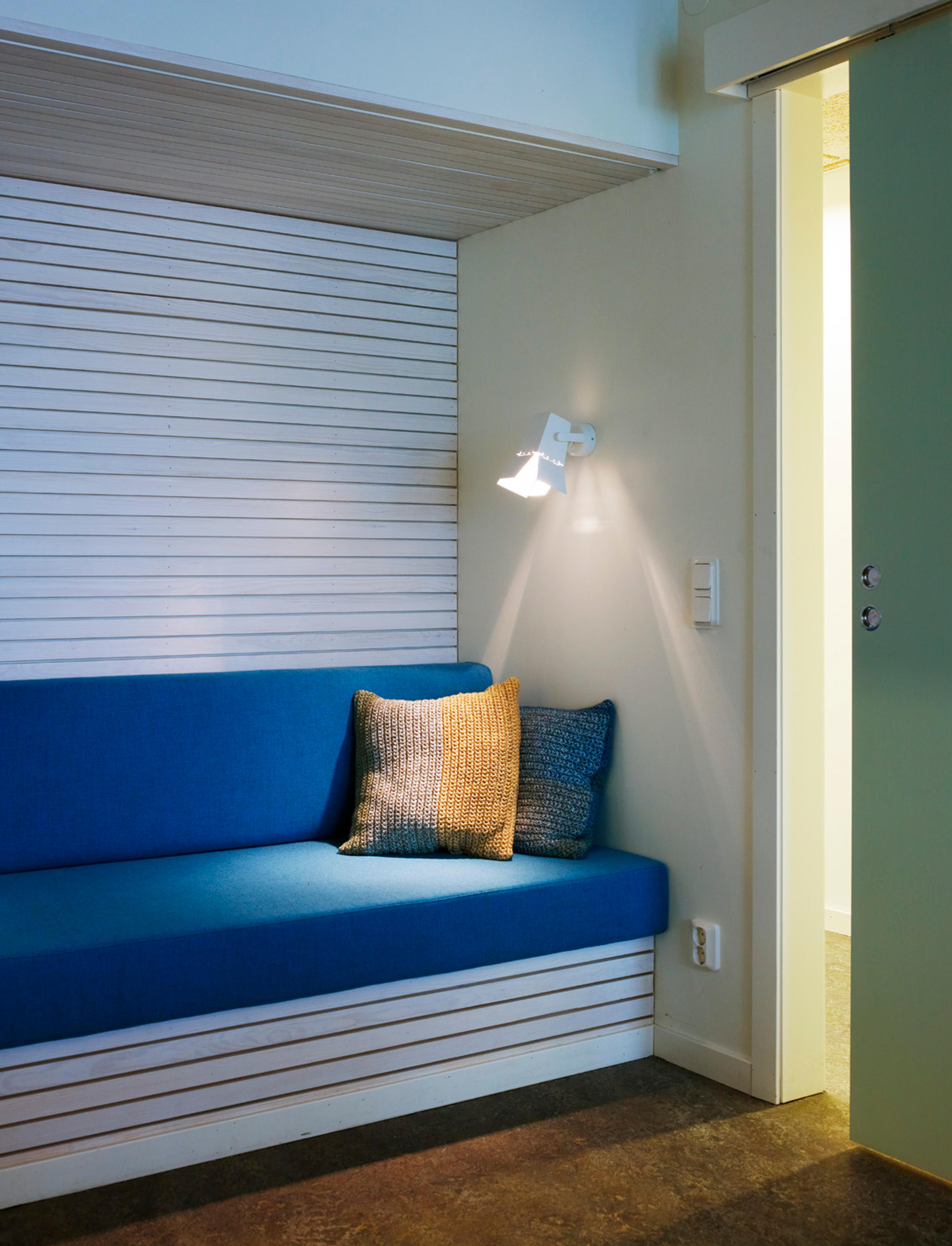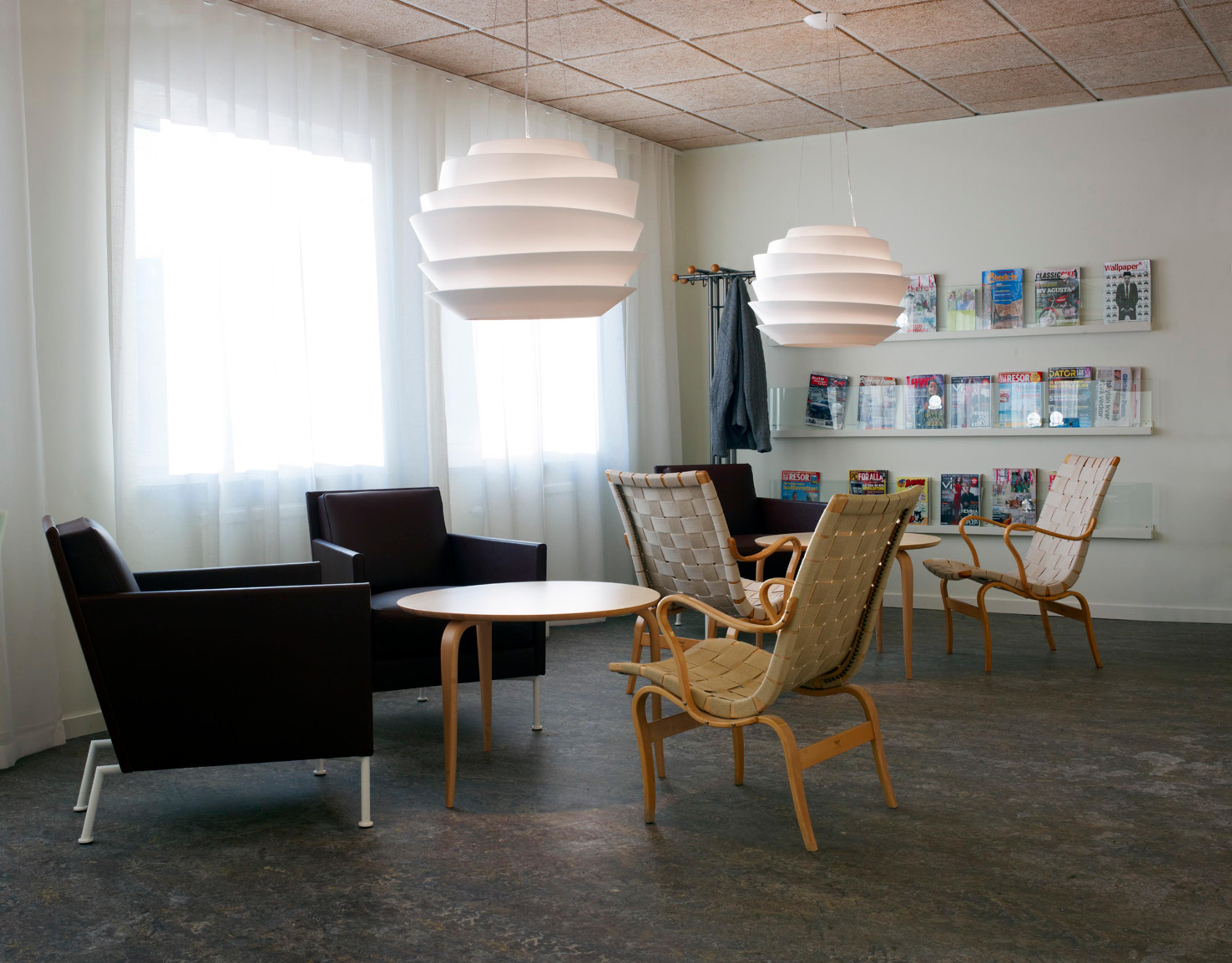 Inredningen har ett mörkt linoleumgov utvecklat av en textildesigner som vanligen arbetar med materialet ull vilket avspeglas i golvets mönster och kulörer. I övrigt är kulörerna i huvudsak milda med några accenter som undantag. Ett udda och roligt tilläggsuppdrag var att ta fram arbetskläder. Personalen kan välja mellan tre olika kulörer som är anpassade för att harmonisera med inredningen.
